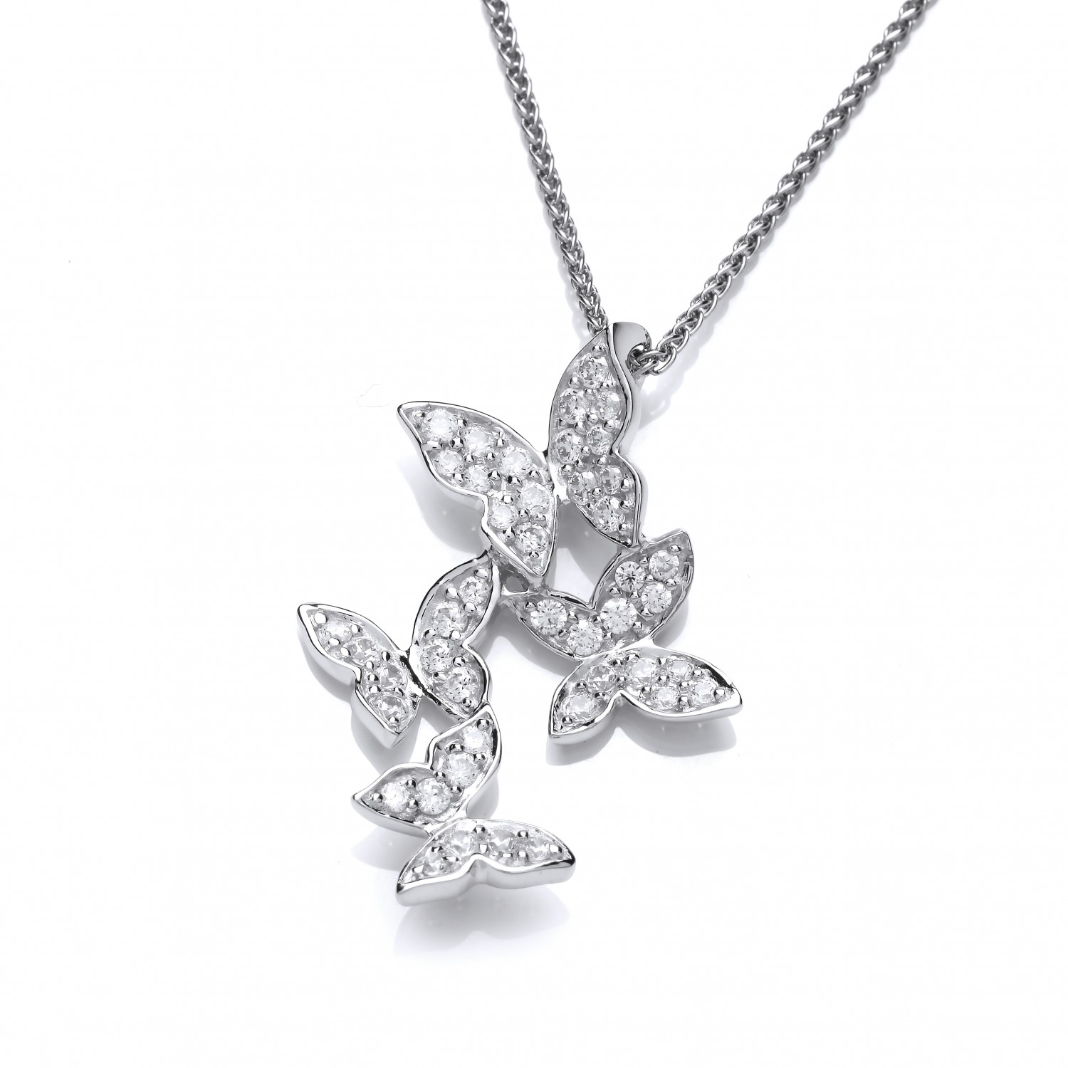 Four beautiful Cubic Zirconia butterflies flutter together in this sparkling silver pendant. This pendant comes on a sterling silver rhodium plated 16 inch spiga chain, with an extender so it can also be worn as an 18 inch.