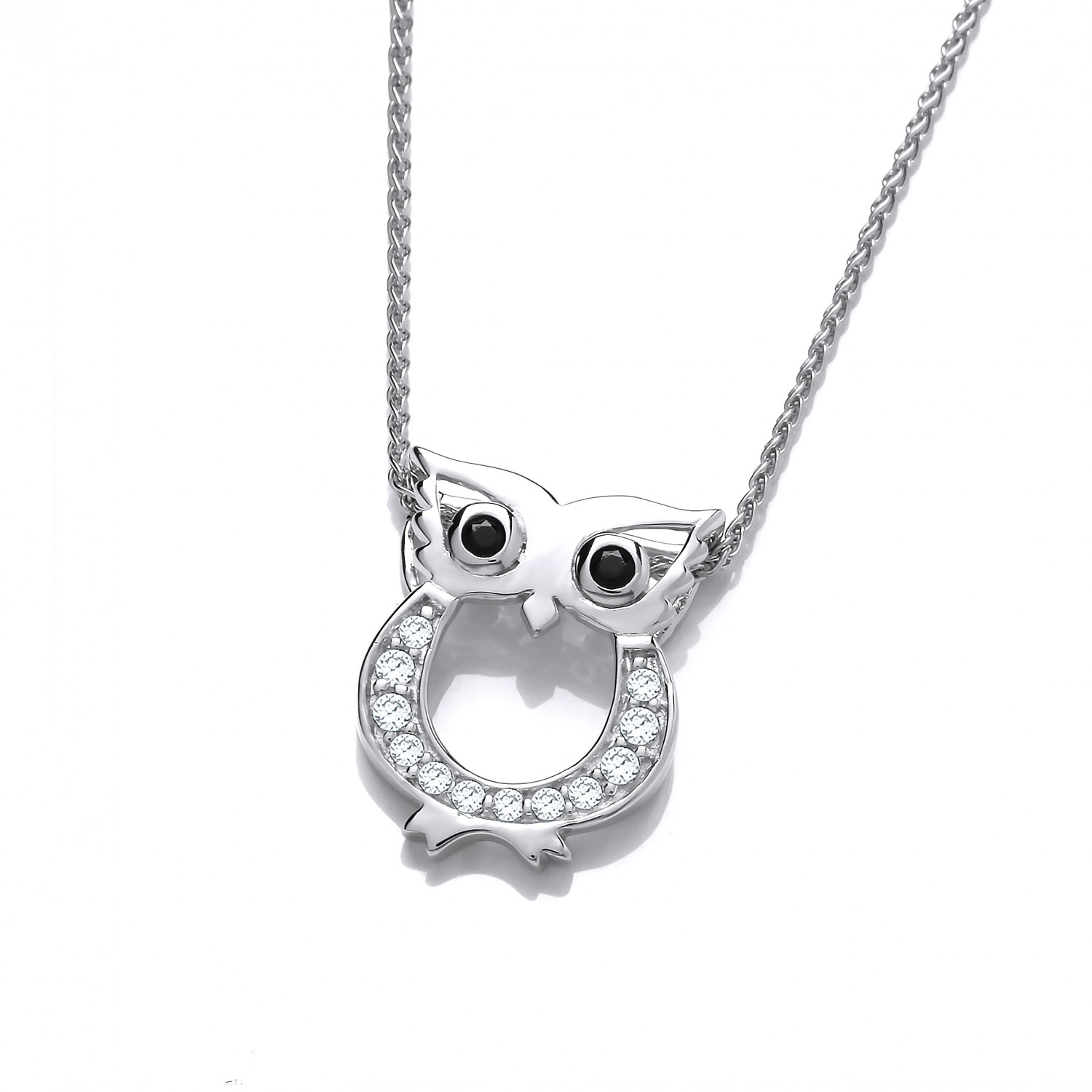 Sterling silver sweet little owl pendant set with Cubic Zirconias, and black Cubic Zirconias as his eyes. This pendant can be purchased on a 16, 18 or 20 inch sterling silver chain.