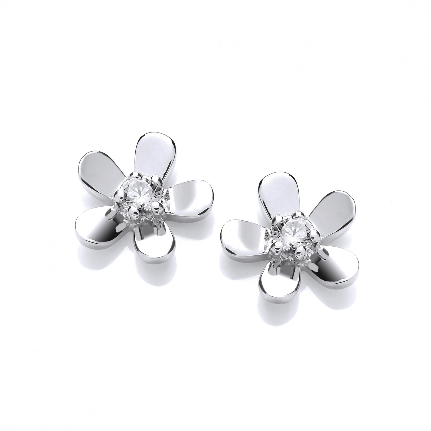 Sterling silver five petal flower studs set with a small Cubic Zirconia in the centre.