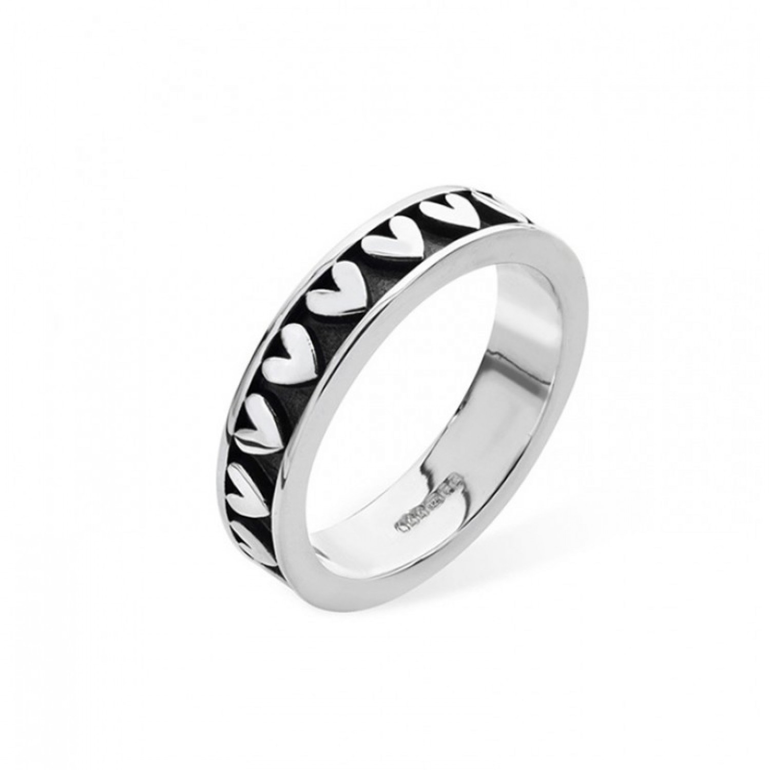 Sterling silver oxidised ring with silver hearts going all the way around.These pieces are lovingly handmade to order and can take up to 2-3 weeks for delivery. Please contact us on 01271 345786 if you require an order urgently and we will see if there is anything we can do.