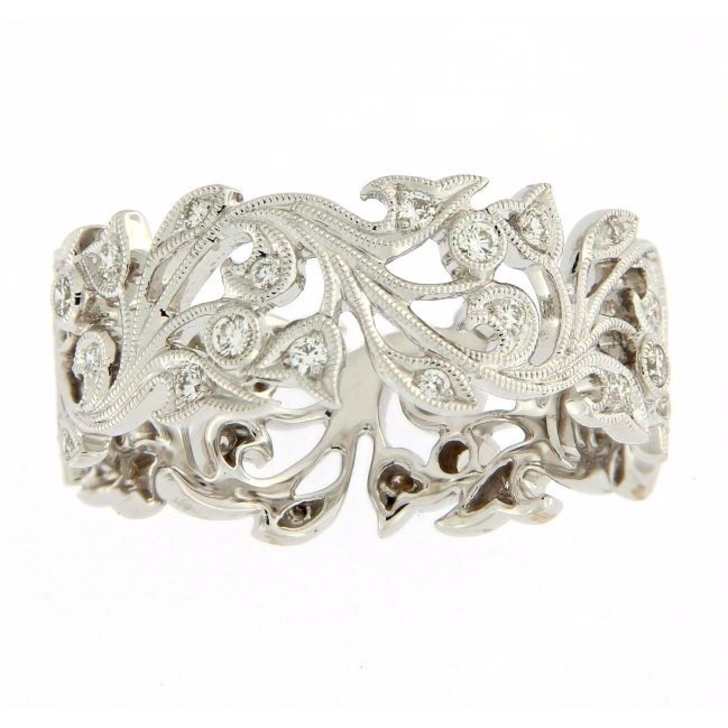 Ungar & Ungar wide flower bud eternity ring, set with round brilliant diamonds and milgrain edging.
